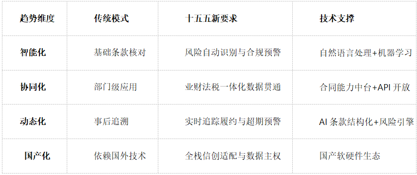 “十五五”期间,合同智能应用的核心使命正在发生根本性转变。据行业专家预测,合同管理将呈现四大发展趋势: