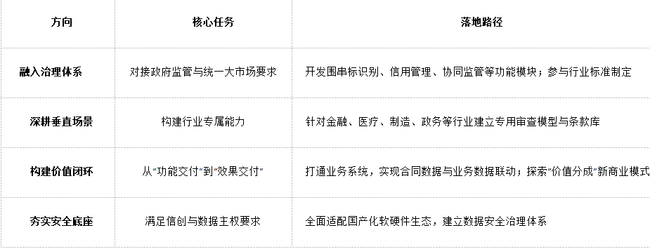 综合政策、产业与技术趋势,合同智能应用厂商在“十五五”期间应聚焦以下战略方向: