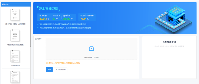 合同起草完成还,还可以通过范本识别功能,实现合同范本管理,准确识别承办人在线下编辑的合同是否使用了标准范本;还可以实现对范本使用率的统计,是合规化管理的重要决策数据。(如下图所示)